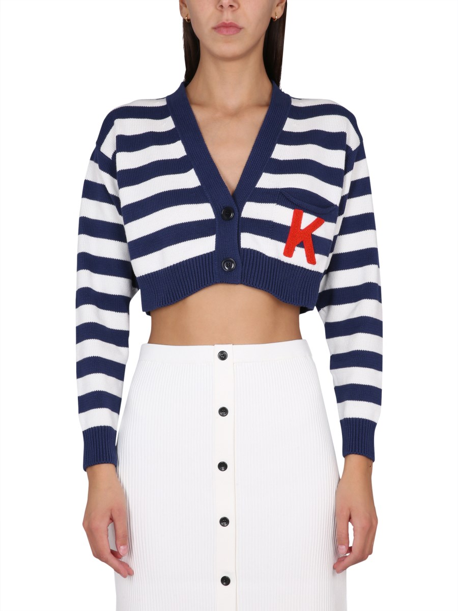 Questo cardigan in cotone è caratterizzato da strisce jacquard che richiamano lo stile nautico di questa stagione. La patch "K" sulla tasca sinistra contrasta con le righe del capo. Il taglio cropped e il colletto con scollo a V conferiscono a questo modello un fascino molto femminile.