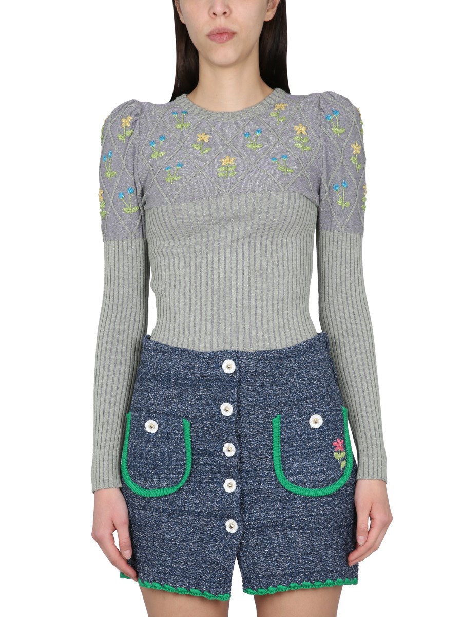 composizione- GIROCOLLO - FIORI RICAMATI A LANA FRONTALE- MANICHE A SBUFFO - REGULAR FIT - 100% LANA - MADE IN ITALY - LA MODELLA E' ALTA 180 CM E INDOSSA LA TAGLIA 40 IT