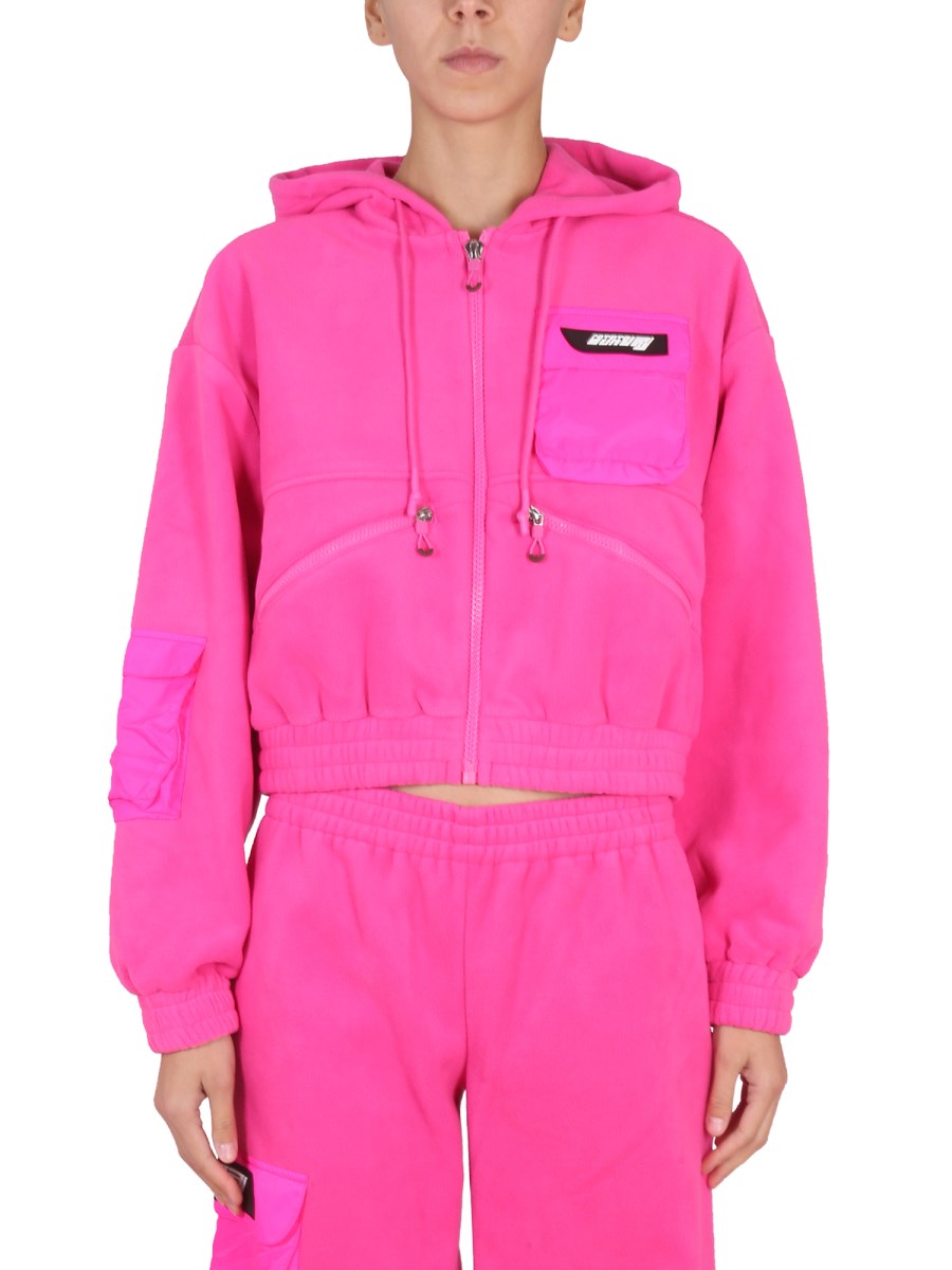 composizione- CAPPUCCIO CON COULISSE- CHIUSURA CON ZIP- UNA TASCA APPLICATA AL PETTO- DUE TASCHE LATERALI CON ZIP- 100% POLIESTERE- LA MODELLA È ALTA 180 CM E INDOSSA LA TAGLIA S