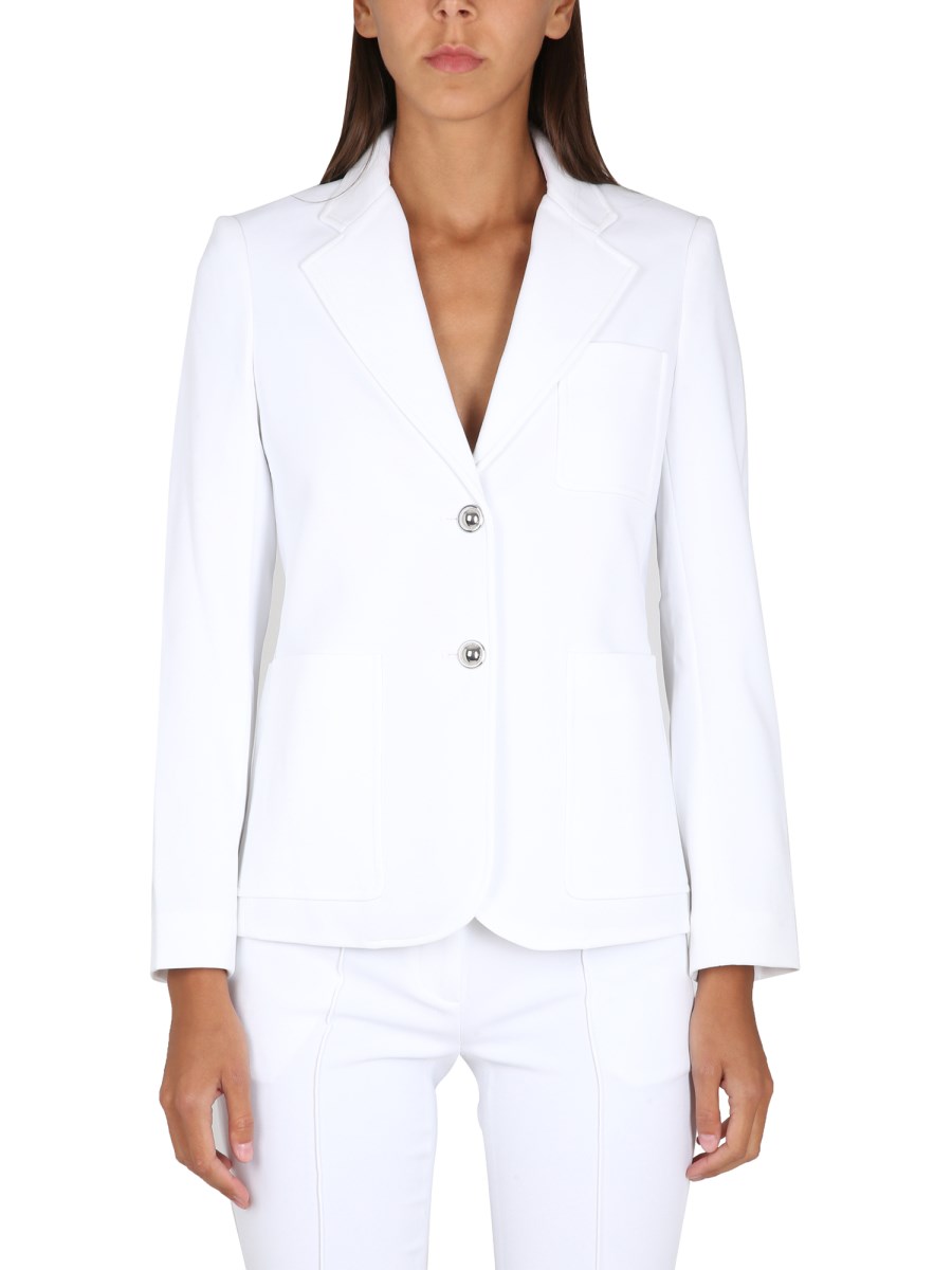 composizione- REVERS A DENTE- CHIUSURA MONOPETTO CON BOTTONI- UNA TASCA APPLICATA AL PETTO- DUE TASCHE LATERALI- 92% POLIESTERE, 8% ELASTAN- LA MODELLA È ALTA 180 CM E INDOSSA LA TAGLIA 2