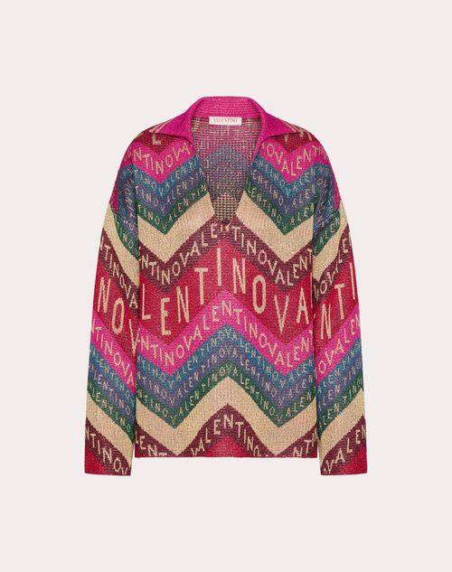 Maglia in Lurex Valentino Chevron - Scollo kaftano - Lurex e Valentino Chevron (81%Viscosa, 19%Fibra Metallica) - Lunghezza 67 cm da punto spalla per la taglia S IT - Lunghezza manica 79 cm da centro dietro per la taglia S IT - La modella è alta 176 cm e indossa una taglia S IT - Made in ItalyIl look è completato con una borsa Valentino Garavani Escape Collection 2024 e scarpe Valentino Garavani Escape Collection 2024.
