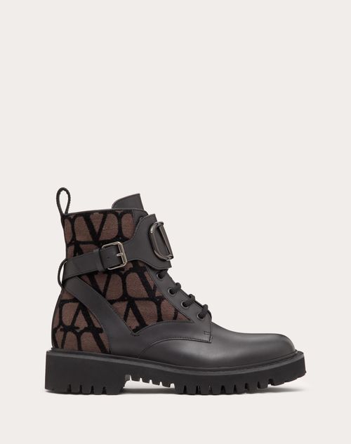 Combat boot Valentino Garavani in vitello e tessuto Toile Iconographe con decorazione VLogo Signature- Accessorio VLogo Signature finitura tono su tono- Fondo carrarmato in gomma- Altezza tacco 35mm/0,8''- Altezza gambale 14cm/5,5'' in taglia 37 IT- Made in Italy