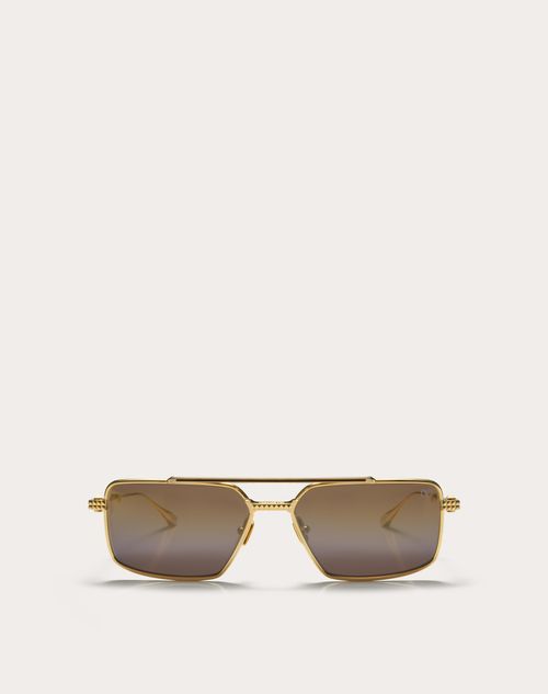 VI - Occhiale rettangolare in metallo.Nata da un paesaggio onirico, intrisa di eleganza e inclusività, la nuova COLLEZIONE VALENTINO EYEWEAR riafferma la scelta di autenticità e la tradizione couture della Maison attraverso la maestria artigianale giapponese.CARATTERISTICHE - Occhiale su misura in titanio e oro chiaro, ponte con stud tridimensionali pressati, barretta superiore marrone in smalto e titanio. - Aste in titanio con stud pressato e vite superiore della cerniera a forma di stud, estremità con stud in rilievo e tridimensionale. - Naselli in ceramica con VLogo pressato.- Tag RFID sull'estremità inferiore dell'asta sinistra.- Lente base 4 marrone scuro/oro con specchiatura flash e contrasto elevato CR-39.- Protezione UV 100%.- Predisposizione per lenti graduate.- Occhiali unisex.- Realizzato a mano in Giappone.PACKAGING- Custodia in pelle riciclata con tracolla e panno per la pulizia.DIMENSIONI- Lunghezza aste: 14,2 cm- Larghezza totale occhiale: 14,8 cm- Larghezza lenti: 5,8 cm- Altezza lenti: 3,7 cm- Ponte: 1,7 cm