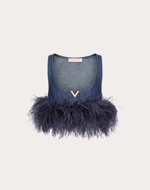 Top In Chambray Denim - Ricamo di piume - Dettaglio V Gold frontale - Chambray Denim (100%Cotone) - Sfoderato - Lunghezza 34,5 cm da punto spalla per la taglia 40 IT - La modella è alta 176 cm e indossa una taglia 40 IT - Made in ItalyIl look è completato con una borsa Valentino Garavani Alltime e scarpe Valentino Garavani VLogo Easyjog.