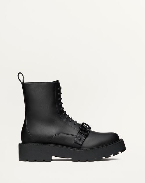 Combat boot Valentino Garavani in vitello con decorazione VLogo Signature- Cinturino con fibbia personalizzata VLogo Signature finitura tono su tono- Zip interna laterale- Guardolo personalizzato con motivo VLogo Signature a rilievo- Fondo carrarmato in gomma- Altezza tacco 45mm/1,75" con 25mm/1" plateau- Altezza gambale 15cm/6" in taglia 37 IT- Made in Italy