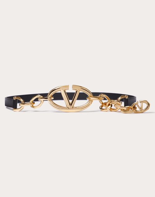 Cintura VLogo The Bold Edition Valentino Garavani in vitello lucido con catena.- Finitura colore Oro chiaro- Esterno in Vitello lucido- Chiusura e pendente con dettaglio Vlogo Signature- Dimensioni: H.15 mm- Made in Italy