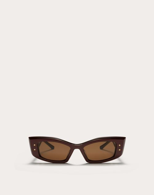 IV - Occhiale da sole rettangolare in acetato.Nata da un paesaggio onirico, intrisa di eleganza e inclusività, la nuova COLLEZIONE VALENTINO EYEWEAR riafferma la scelta di autenticità e la tradizione couture della Maison attraverso la cura artigianale giapponese.CARATTERISTICHE - Robusto acetato giapponese scolpito di colore bordeaux con stud in oro giallo.- Aste in acetato con profondi intagli angolari, estremità lavorate sotto forma di stud in rilievo, rivetti in titanio con quattro stud. - Tag RFID sull'estremità inferiore dell'asta sinistra.- Lente base 4 marrone scuro, contrasto elevato CR-39.- Protezione UV 100%.- Predisposizione per lenti graduate.- Occhiali da sole da donna.- Realizzato a mano in Giappone.PACKAGING- Custodia in pelle riciclata con tracolla e panno per la pulizia.DIMENSIONI- Lunghezza aste: 14,5 cm- Larghezza totale Occhiale da sole: 15 cm- Larghezza lenti: 5,2 cm- Altezza lenti: 3 cm- Ponte: 1,8 cm