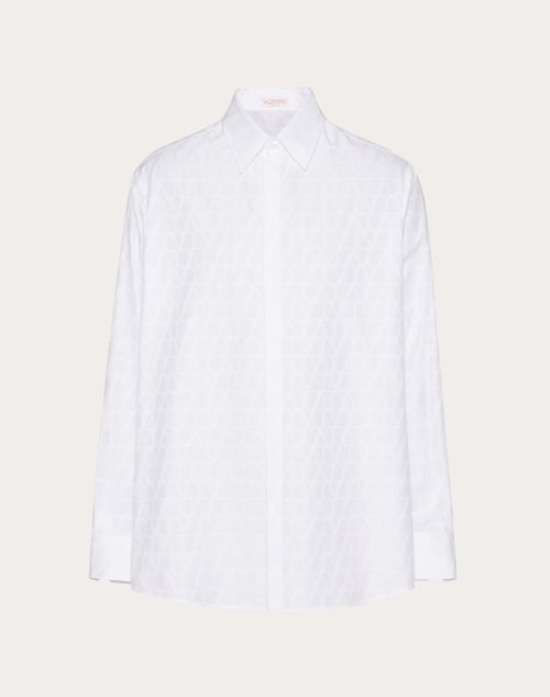 Camicia Valentino in popeline di cotone con motivo Toile Iconographe all over- Regular fit- Motivo Toile Iconographe in jacquard all over- Chiusura con bottoni nascosta- Composizione: 100% Cotone- Lunghezza: 82 cm dall'attaccatura posteriore del collo in taglia 39 IT- Il modello è alto 187 cm e indossa una taglia 39 IT- Made in ItalyIl look è completato con scarpe Valentino Garavani One Stud.
