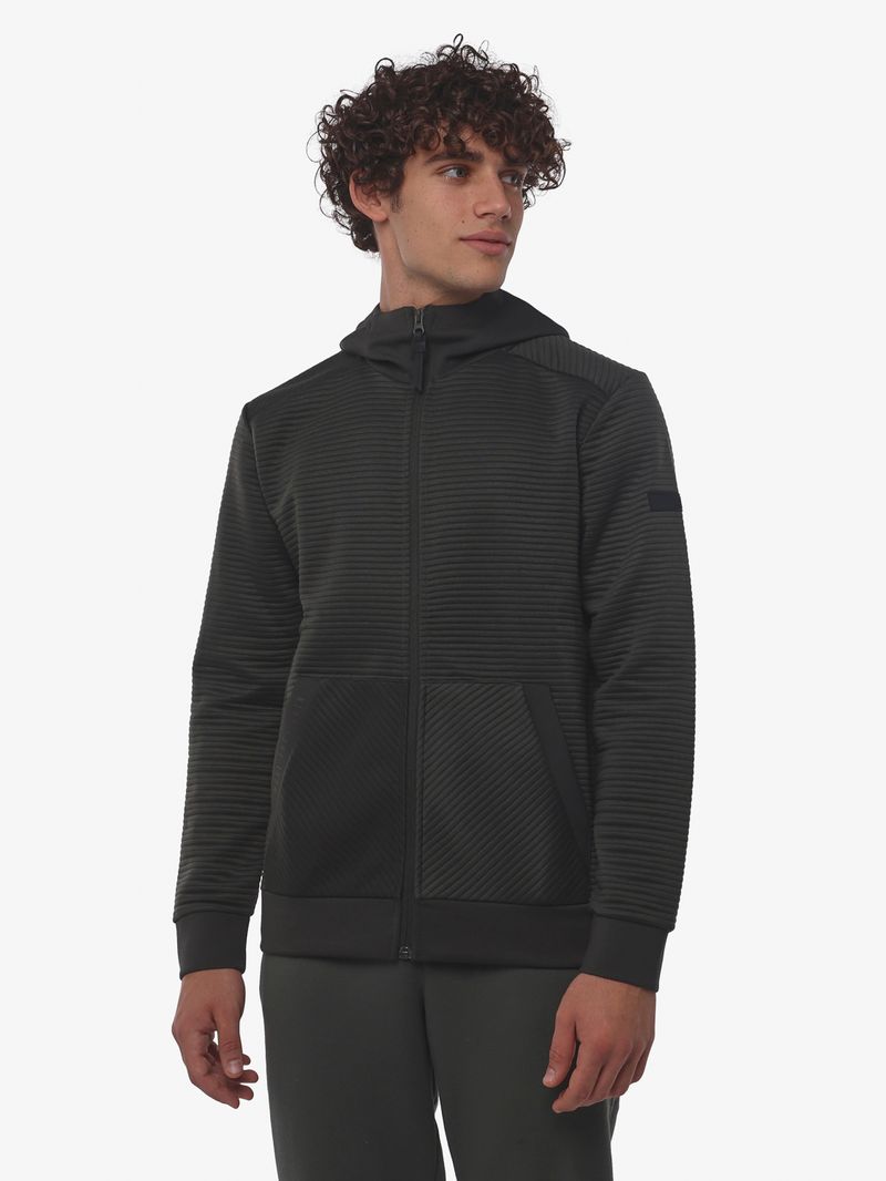 Felpa con cappuccio che abbina due tessuti diversi creando un gioco di texture. Tasche laterali con zip e zip centrale rovesciata.