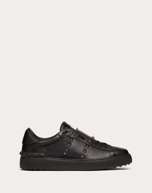Sneaker Valentino Garavani Rockstud Untitled Noir in vitello nero- Banda con applicazione di borchie finitura rutenio- Etichetta speciale con numero 11- Suola in gomma nera con dettaglio borchie in gomma sul retro- Made in Italy
